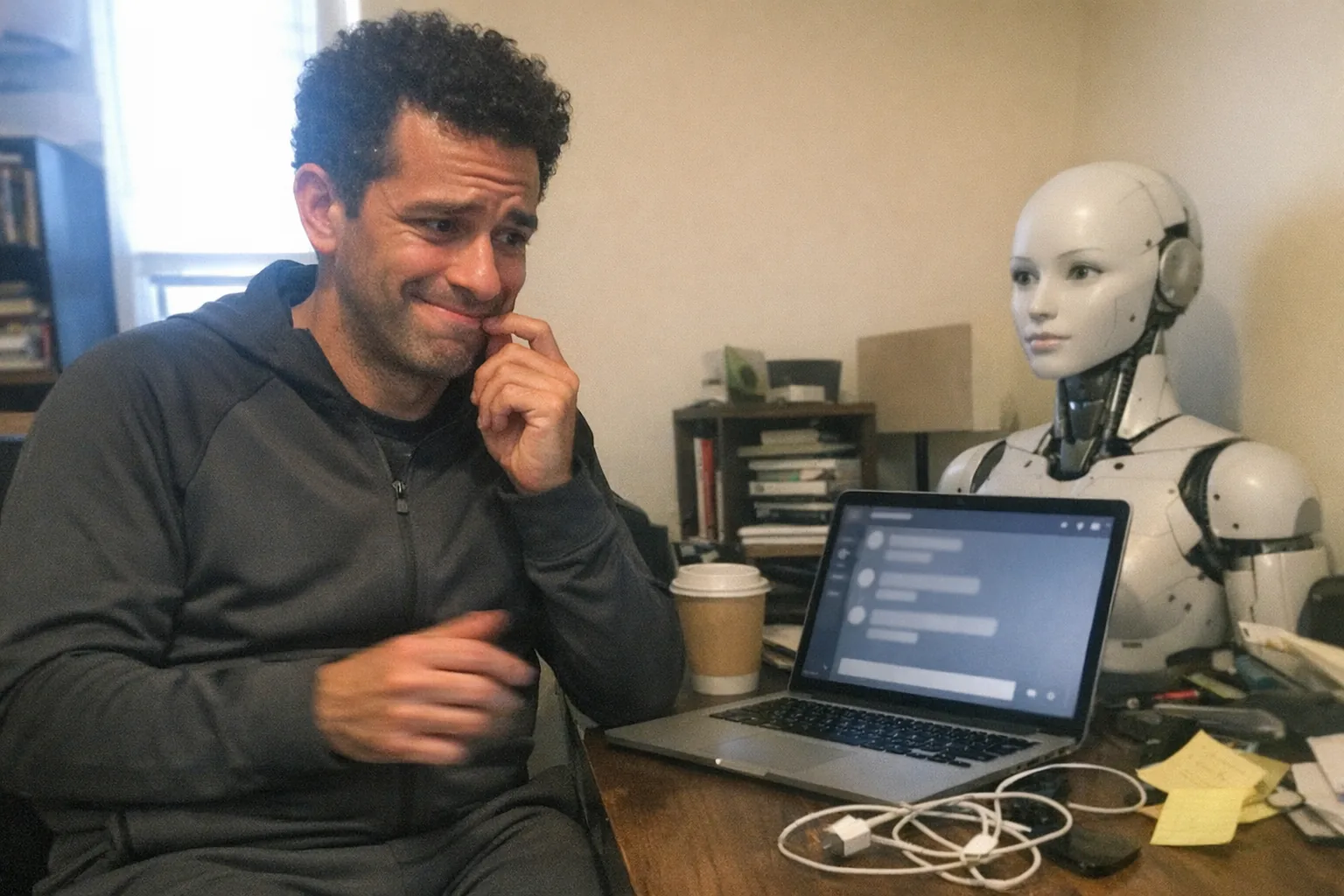 A casual iPhone snapshot in a small home office at night, aggressively mediocre composition with awkward framing and slight motion blur, mildly overexposed desk lamp and uneven lighting, natural phone noise/grain. Primary human: a white male in his mid-20s with fair skin, tall and lanky build, undercut haircut with textured top, wearing a simple tee with a lightweight overshirt; he looks surprised and skeptical (wide eyes, slightly open mouth, one raised eyebrow with a half-smirk) and awkward (uncertain posture, hesitant smile) while glancing between a laptop screen showing a generic emotion-wheel graphic (no readable text) and a female-presenting humanoid robot head/torso on the desk. The scene includes messy cables, a notebook with scribbles, a cheap coffee mug, and a small sensor-like gadget near the robot, implying emotion-sensing/feedback practice. Modern, realistic, imperfect candid phone photo feel; no logos, no brand names, no text, no watermarks; non-explicit.